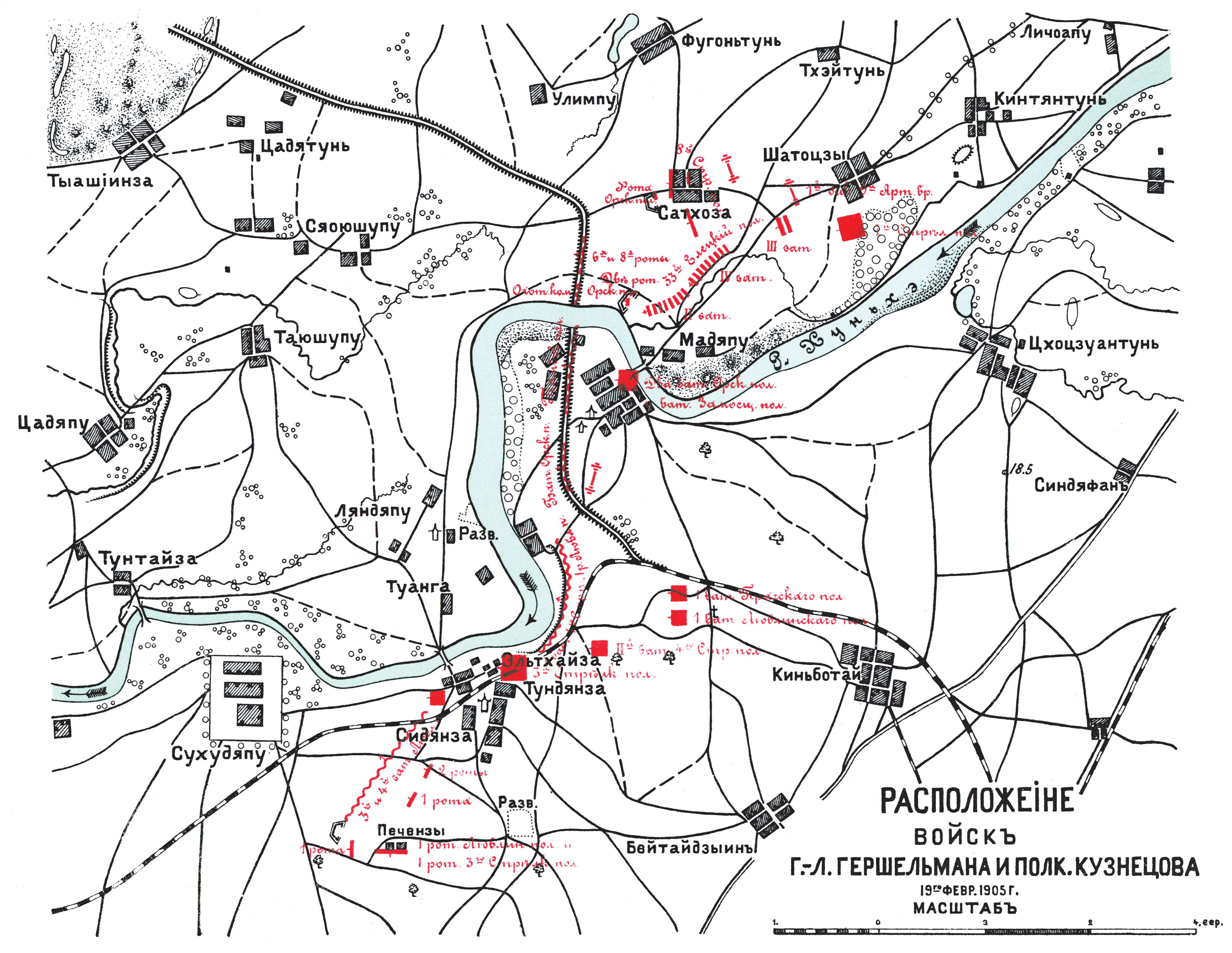 Расположение войск генерал-лейтенанта Гершельмана и полковника Кузнецова 19 февраля 1905 года