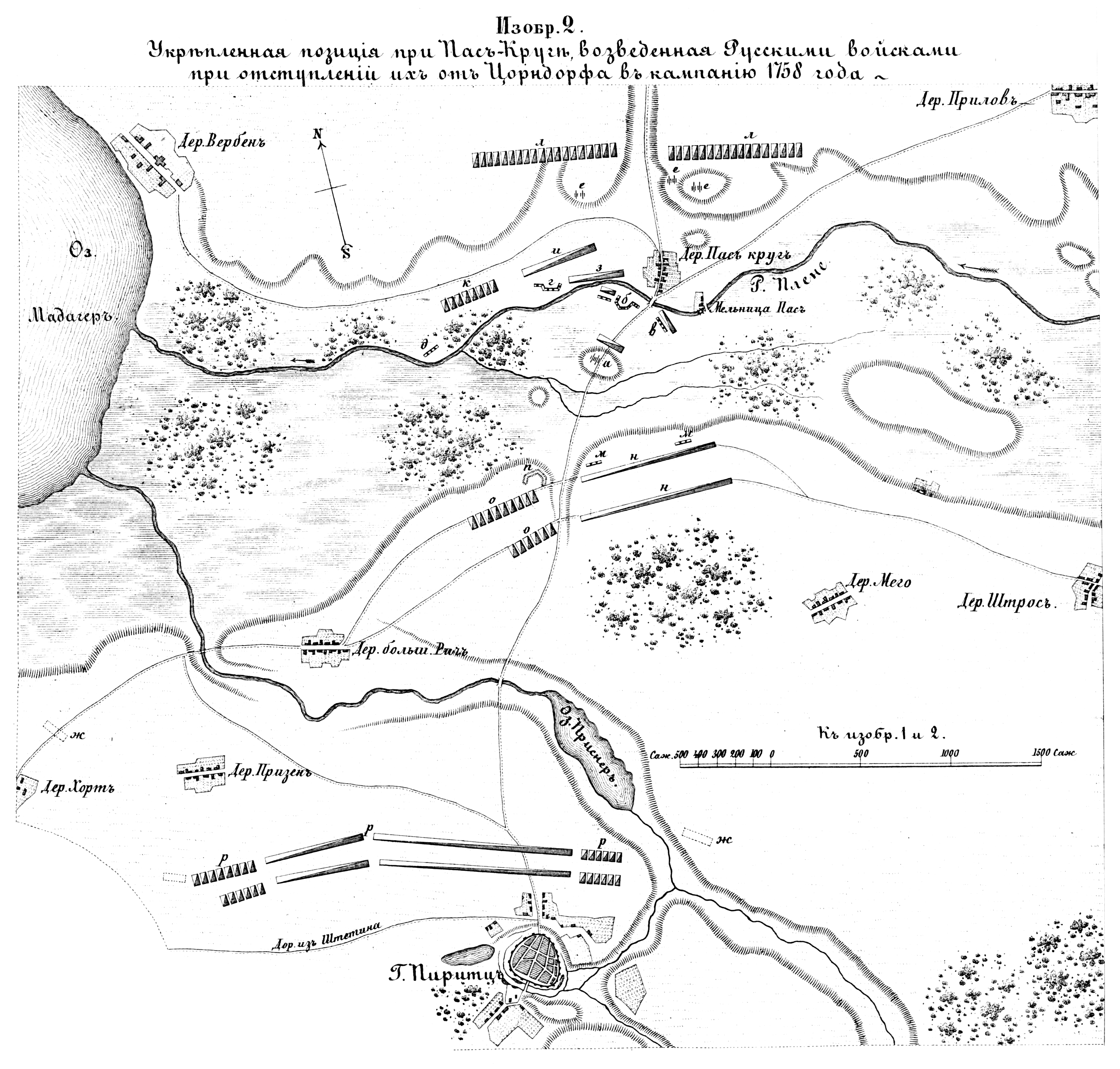 Полевые и временные укрепления. Изобр.2. Укрепленная позиция при Пас-Круг, возведенная русскими войсками при отступлении их от Цорндорфа в кампанию 1758 года
