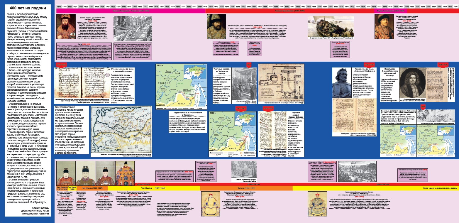 На отдельных лентах показаны правители и события из истории двух стран. Центральное место в книге занимает рассказ про важнейшие даты в истории взаимоотношений России и Китая.