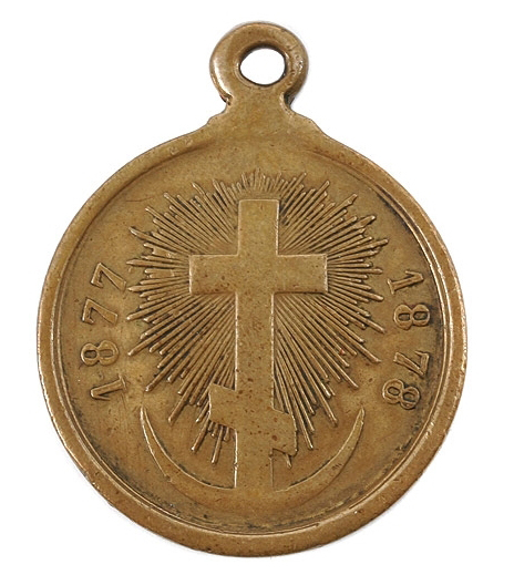 Медаль учреждена Высочайшим Повелением Императора Александра II, объявленным по военному ведомству, 17 апреля 1878 года. В статуте указаны три разновидности медалей по металлу: серебряная, из светлой бронзы и из темной бронзы (медная). Св. бронза, диам. 26 мм. Медалью из светлой бронзы награждались все воинские чины от генерала до рядового солдата, чины морского ведомства и милиции, волонтеры и болгарские ополченцы, которые в течение 1877-1878 годов принимали непосредственное участие в боевых операциях против турок на Дунае, Балканах, Черном море и Кавказе, а также чиновники военного и гражданского ведомств, находившиеся при войсках и принимавшие участие в боевых действиях против неприятеля с оружием в руках. Этой же медалью награждался весь медицинский персонал и священнослужители, выполнявшие свои обязанности в боевой обстановке. Таких светло-бронзовых медалей было отчеканено на Санкт-Петербургском монетном дворе 635921 штука. "Рисунки медалей были утверждены императором 14 сентября 1878 года". Носили медаль на груди на комбинированной ленте двух орденов - Святого Андрея Первозванного и Святого Георгия Победоносца (Андреевско-Георгиевская).