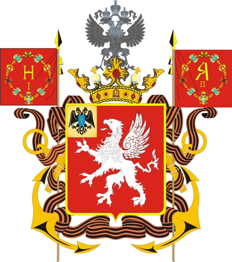 «В червленом щите серебряный гриф с червлеными глазами и языком. В вольной части герб Таврической губернии. Щит увенчан древнею царскою короною, на которой стоит Императорский орел. За щитом два скрещенных золотых якоря, а по сторонам щита два червленые знамени, соединенные лентой ордена Св. Великомученика и Победоносца Георгия. На правом знамени золотой вензель в Бозе почившего Государя Императора Николая I, а на левом такой же вензель в Бозе почившего Государя Императора Александра II; оба вензеля украшены Императорскою короною и цепью ордена Св. Апостола Андрея Первозванного».