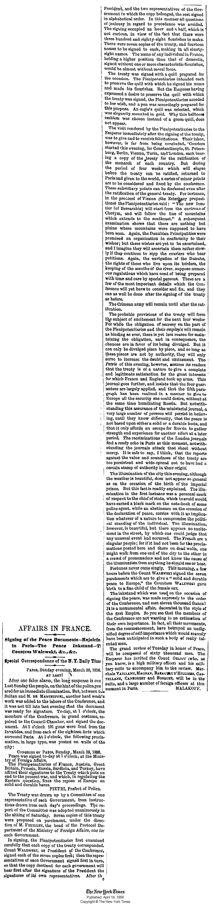 Сообщение "The New York Times" о подписании Парижского трактата, завершившего Крымскую войну.
