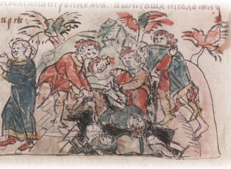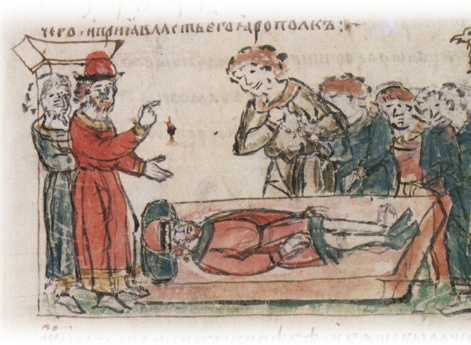 Повеление Ярополка Свыятославича о поиске трупа убитого брата Олега Святославича; положение трупа Олега на ковер.