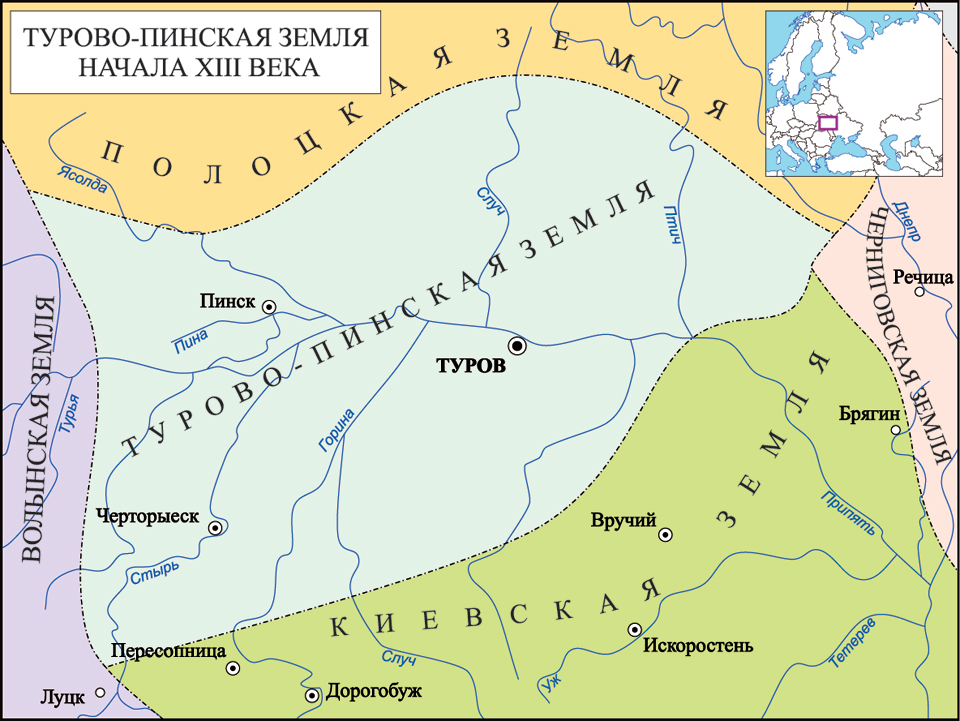 До начала XII века Туровская волость находилась под властью киевских князей. В 1150-е гг. она закрепляется за внуком киевского князя Святополка Изяславича (он, в свою очередь, был внуком Ярослава Мудрого по линии его сына Изяслава Ярославича) - Юрием Ярославичем, затем за его потомками и становится независимой от Киева. В XIII веке главным городом земли становится Пинск. Турово-Пинская земля была слабым политическим образованием и в середине — второй половине XIII в. находилась под сильным влиянием Галицко-Волынской Руси и Литвы. В конце XIII или начале XIV в. перешла под власть Литвы.