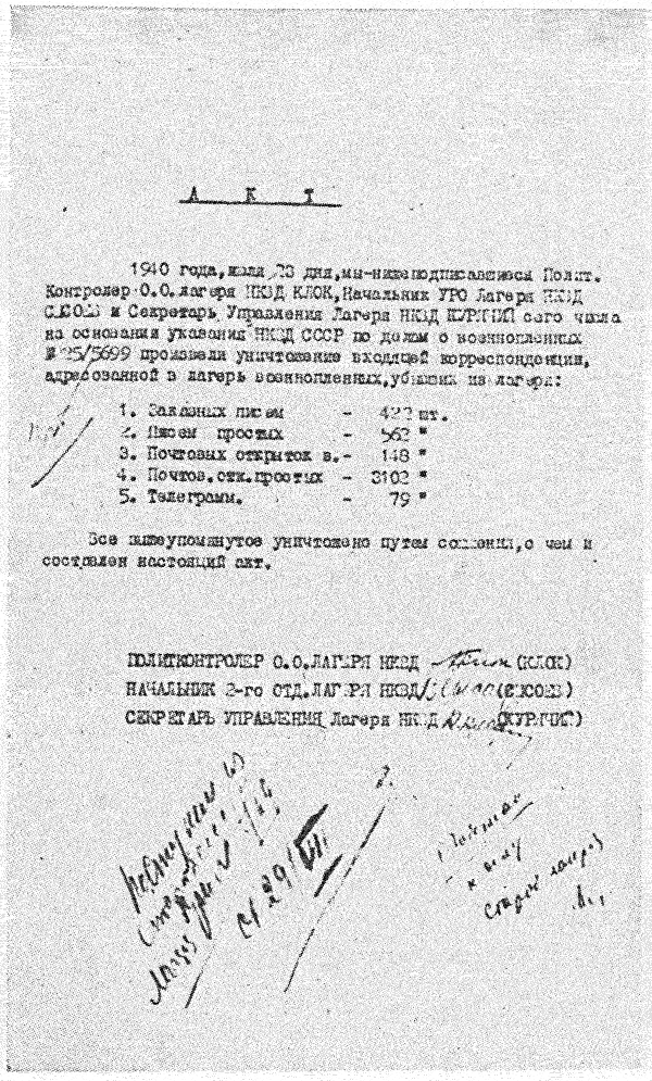 1940 год, 23 июля Акт уничтожения корреспонденции, убывших военнопленных, путем сожжения.