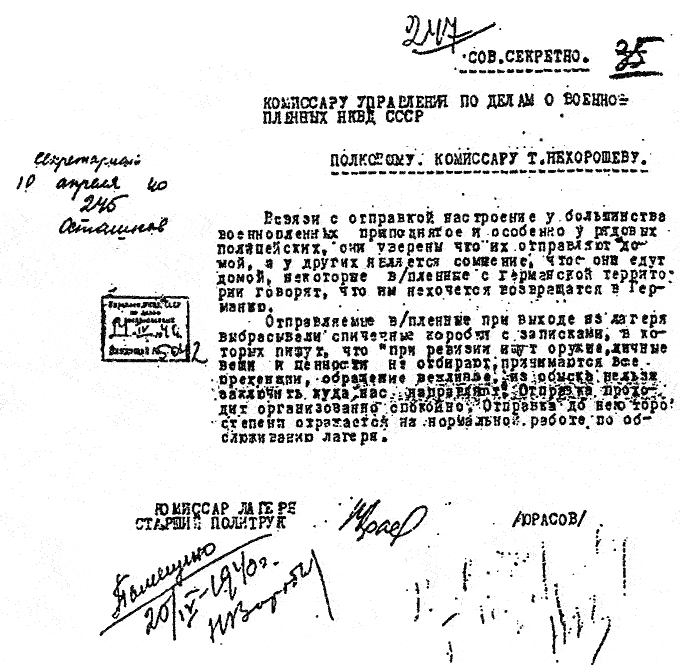 1940 год, 10 апреля Донесение политкомиссара Осташковского лагеря И. А. Юрасова С. В. Нехорошеву о настроениях военнопленных, отправляемых из лагеря.