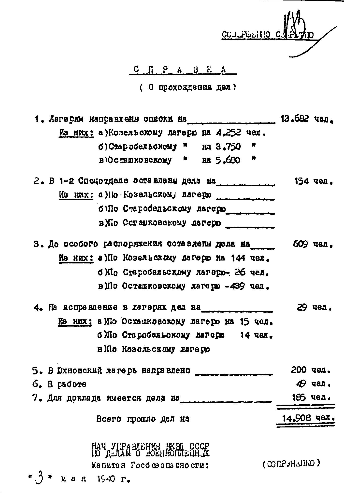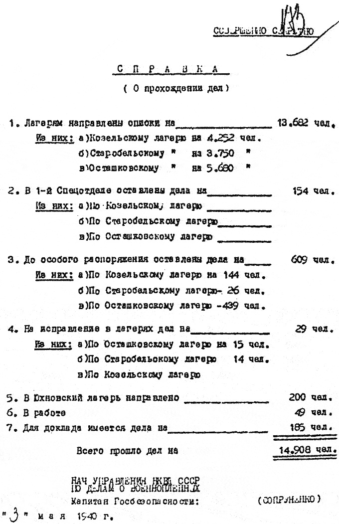 1940 год, 3 мая Справка П. К. Сопруненко о прохождении дел на польских военнопленных по Козельскому, Осташковскому и Старобельскому лагерям.