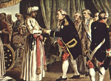 Дело в том, что в этот момент в Индию прибыл граф Джордж Макартни, которого французы не так давно разбили на острове Гренада. Макартни прославился тем, что, сдавшись в плен, долго торговался об условиях капитуляции, чего французский адмирал д’Эстен откровенно не понял и разрешил своим солдатам и морякам немного пограбить богатый остров. В результате бравые французские морячки растащили все фамильное серебро губернатора, одежду, личные вещи, и на ужин к д’Эстэну Макартни заявился, кутаясь в халат, поскольку более у него никакой одежды не осталось.