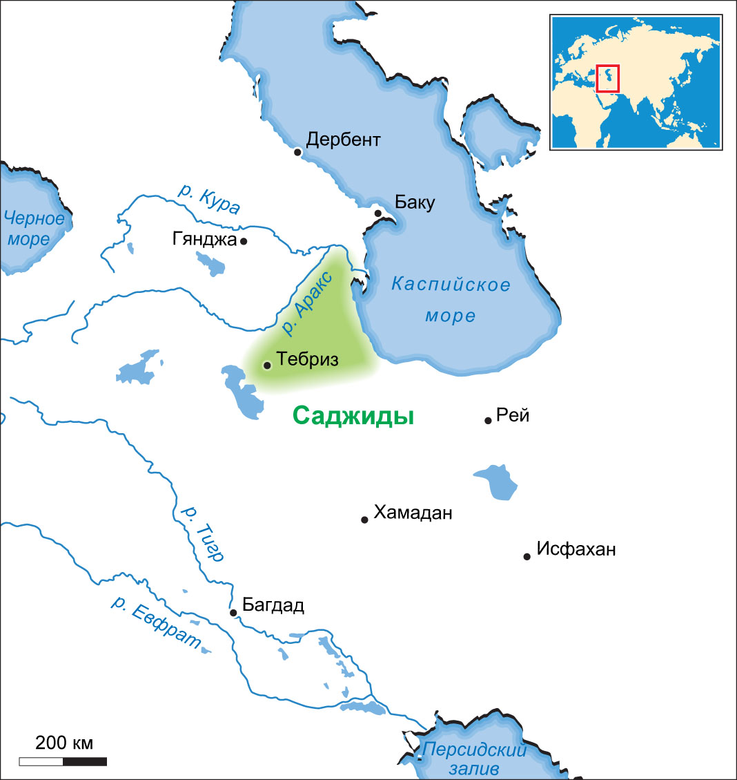 «Абу-с-Садж Дивдад был наместником Куфы и Ахваза до своей смерти, последовавшей в 879 (266) г. В это время его сын Мухаммед был наместником Хиджаза; но в 269 г. его перевели в Анбар, а в 276 г. — в Адербиджан, к которому в 898 (285) г. присоединили Армению. После его смерти его брат Юсуф, бывший в 884 (271) г. валием Мекки, наследовал ему в качестве наместника Армении и Адербиджана, устранив сына Мухаммеда, Дивдада. Юсуф в 918 (306) г. сделал нашествие на Рей и в следующем году был заключен в тюрьму халифом, но в 922 (310) г. был восстановлен в своей должности. Он в 311 г. присоединил к своим владениям Рей и вел войну с карматами. В 931 (319) г. наместником Адербиджана был назначен Муфлих, вольноотпущенный Юсуфа»