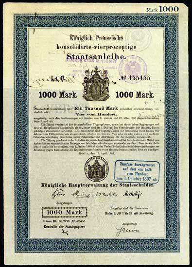 Облигация прусского государственного займа стоимостью в 1000 марок.