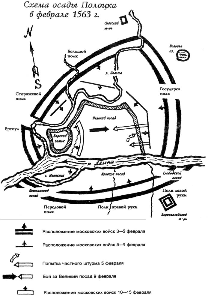 К назначенному сроку к Великим Лукам успели подойти все отряды. В один день! Это образец гибкости и слаженности военной машины Московского государства, удивительный даже и для последующих столетий. Из истории западноевропейского военного искусства в один ряд с подготовкой и сбором войск Ивана IV в зимнюю кампанию 1562-1563 гг. можно поставить, пожалуй, один лишь знаменитый марш армии Оливера Кромвеля к Вустеру. Как тут не вспомнить похвалу А. Гваньини русскому дворянству, собиравшемуся в поход с удивительной быстротой, по первому приказу царя. К подобным спешным, но четко организованным действиям русские воинские люди были приучены столетиями противостояния молниеносным набегам ордынцев. Гибкость военного управления в период Московского государства справедливо отмечал Дж. Кип, противопоставляя ее регулярному, но всебюрократизированному и громоздкому военно-административному аппарату Российской империи. Миттельшпиль полоцкой партии начался с расстановки полков вокруг города, занявшей весь день 31 января. Перемещения полков выдают колебания командования московской армии относительно выбора направления главного удара. Первоначально, видимо, предполагалось нанести его из Задвинья, штурмуя город по льду Двины. 3 февраля в расположении войск была сделана важная перемена: «учалася река портитися», и поэтому сильнейший государев полк был переведен за реку и поставлен «у Егорья Великого», а на место государева полка был отправлен более слабый полк левой руки. Сторожевой полк, еще менее многочисленный, встал между большим полком и ертоулом - следовательно, сменил на этом месте ушедший в Задвинье полк левой руки. Мотивировка всех этих передвижений очевидна: атаковать Полоцк из Задвинья по хрупкому льду, или тем более во время ледохода - полное безумие, и в результате перегруппировки сил основная часть русских войск была сконцентрирована против городских стен Великого посада (большой полк с севера и государев полк с востока). Наряд с 31 января стоял «меж Георгия Святого и Волова озера». Таким образом, направление основного удара переместилось.