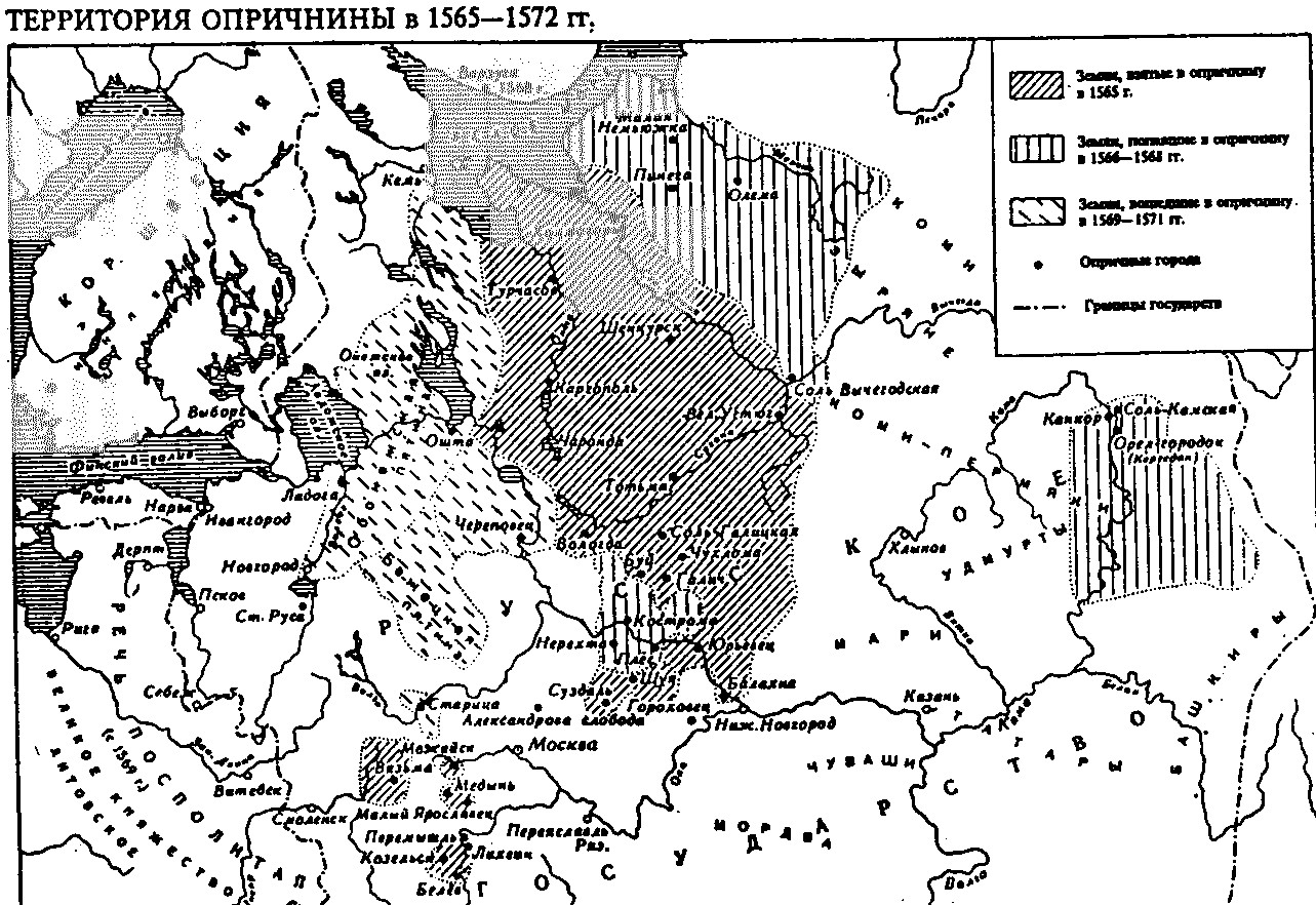 Территория опричнины в 1565-1572 гг. «Москва с нетерпением ждала Царя, и долго; говорили, что он занимается тайным делом с людьми ближними; угадывали оное не без боязни. Наконец, 2 Февраля, Иоанн торжественно въехал в столицу и на другой день созвал Духовенство, Бояр, знатнейших чиновников. Вид его изумил всех. Опишем здесь наружность Иоаннову. Он был велик ростом, строен; имел высокие плечи, крепкие мышцы, широкую грудь, прекрасные волосы, длинный ус, нос римский, глаза небольшие, серые, но ...