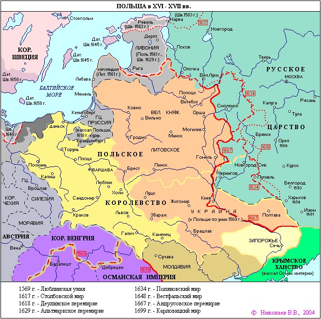Карта Польши в 16-17 вв.«Андрусовское перемирие 1667 между Россией и Речью Посполитой на 13,5 лет; завершило русско-польскую войну 1654—67 гг. за Украину и Белоруссию. Подписано 30 января А. Л. Ордын-Нащокиным (Россия) и Ю. Глебовичем (Польша) в деревне Андрусове близ Смоленска. Польша возвратила России Смоленское и Черниговское воеводства и признала воссоединение с Россией Левобережной Украины. Правобережная Украина и Белоруссия остались под властью Польши. Киев должен был остаться за Росс...