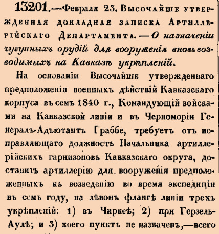 13201. 1840 год. 7 марта (23 февраля ст.ст.) Высочайше утвержденная докладная записка Артиллерийскаго Департамента. О назначении чугунных орудий для вооружения вновь возводимых на Кавказе укреплений.На основании Высочайше утвержденнаго предположения военных действий Кавказскаго корпуса в сем 1840 года, Командующий войсками на Кавказской линии и в Черномории Генерал-Адъютант Граббе, требует от исправляющаго должность Начальника артиллерийских гарнизонов Кавказскаго округа, доставить артиллерию для вооружения предположенных к возведению во время экспедиции в сем году <…>