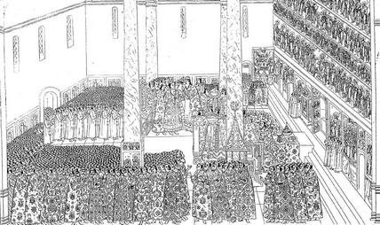 Коронование царя Михаила Феодоровича в Успенском соборе. Литография XIX века с гравюры XVII века