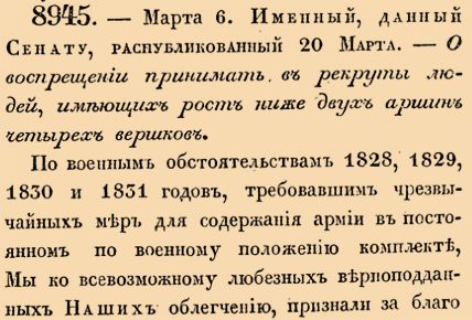 8945. 1836 год. 18 марта (6 марта ст.ст.) Именный, данный Сенату, распубликованный 20 марта. О воспрещении принимать в рекруты людей, имеющих рост ниже двух аршин четырех вершков. По военным обстоятельствам 1828, 1829, 1830 и 1831 годов, требовавшим чрезвычайных мер для содержания армии в постоянном по военному положению комплекте, Мы ко всевозможному любезных верноподданных Наших облегчению, признали за благо ограничить меру роста людей, сдаваемых в рекруты по произведенным в сии годы наборам двумя аршинами тремя вершками, вместо роста определеннаго существовашими узаконениями, в два аршина четыре вершка.