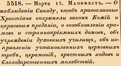 5518. 1730 год. 28 марта (17 марта ст.ст.) Манифест. О наблюдении Синоду, чтоб православные Христиане сохраняли закон Божий и церковныя предании, о возобновлении храмов и странноприимных домов, об учреждении духовных училищ, об исправлении установленных церковных треб, церемоний, крестных ходов и благодарственных молебствий.По вступлении Нашем на престол Российской Империи, ревнуя закону Божию, во первых, прилежное попечение имеем о хранении и защищении православнаго закона Христианскаго Восточныя церкви и прочих преданий, славы ради и хвалы Божия учрежденных <…>