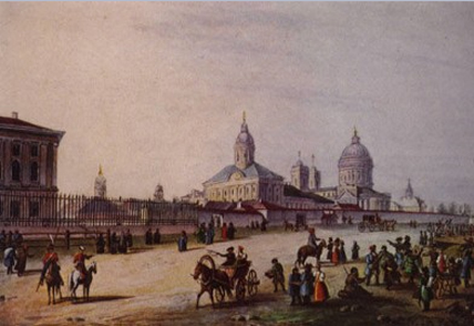 По правому берегу Черной речки должно было разместиться каменное монастырское строение, а по левую – деревянные гражданские постройки. Назначенный главой монастыря архимандрит Феодосий водрузил на избранном месте два креста: один на правой стороне Черной речки, а другой на левой. На кресте, водруженном на правой стороне, сделана была надпись: "Во имя Отца и Сына и Святаго Духа, повелением Царскаго Пресветлаго Величества на сем месте имеет создатися Монастырь". А на левой стороне Черной речки водружен был крест с надписью: "Что сей крест образует, обонполный то сказует".