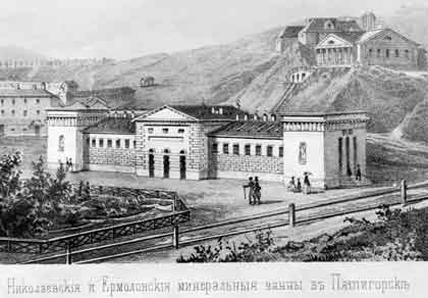 Николаевские и Ермоловские ванны в Пятигорске. Открытка 19 века.В 1801-1802 годах химик Симсен, аптекарь Швенсон, штаб-лекари Гординский и Крушневич изучили химический состав нарзана и пятигорских углекисло-сероводородных вод. В заключении химика Симсена было сказано, что кавказские минеральные воды обладают благотворным воздействием на больного человека. Исследователи внесли ряд ценных рекомендаций по обустройству источников и заселению ближайших окрестностей, о чем было доложено императору Александру I. Высочайшее повеление императора Александра II Астраханскому военному губернатору князю Павлу Дмитриевичу Цицианову Высочайше утвержденный доклад Министра Внутренних дел. – Об определении к Кавказским минеральным источникам двух врачей с жалованьем.