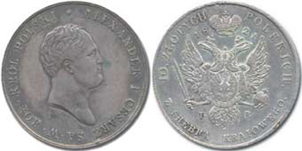 Польский десятизлотовик 1820-1827 гг.«Александр I стремился сохранить соперничество Австрии и Пруссии, ослаблявшее вес и влияние каждой из них. В то же время он не мог допустить чрезмерного ослабления Франции, способной отвлечь на запад силы германских государств.Из «Дружественного трактата, заключенного в Вене, между Их Величествами Императором Всероссийским и Императором Австрийским и Королем Прусским – Об утверждении благосостояния Поляков»