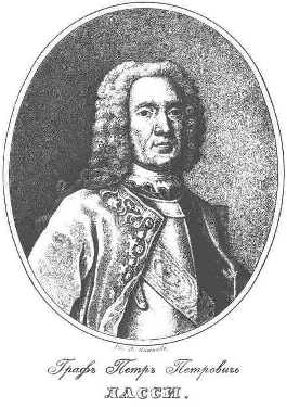 Граф Петр Ласси. Гравюра 18 века«Весной 1739 года армия Миниха (68000 при 251 орудиях) сосредоточилась в киевском районе. Операционным направлением, вместо принятой дотоле линии Переволочна — Бендеры, сделалась линия Киев — Яссы, представлявшая значительные выгоды, как в смысле преодолевания меньших естественных преград (Буг и Днестр в их верхнем течении), так и особенно, в смысле удобного довольствия войск (обильная Киевщина и Подолия вместо пустынных очаковских степей). Правда, путь в...