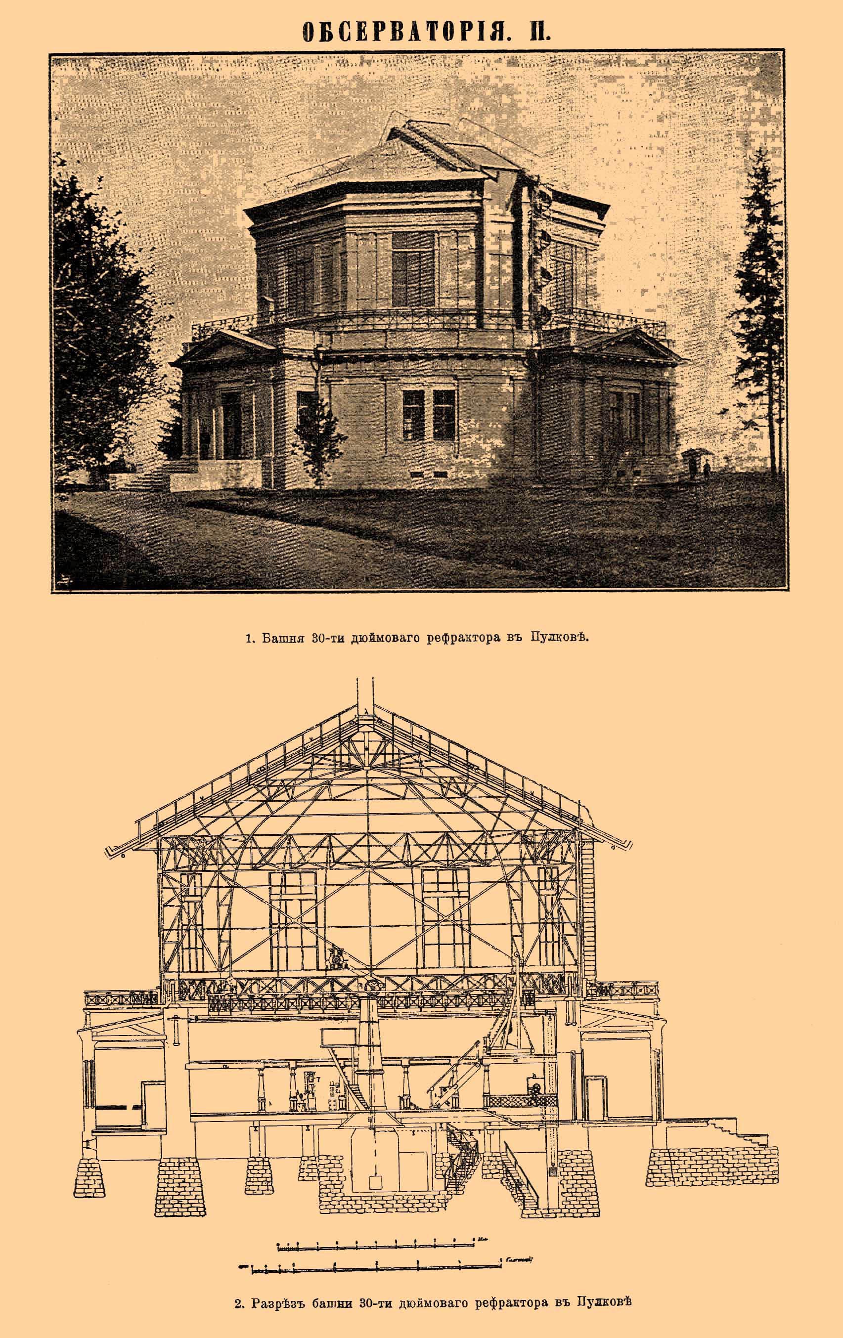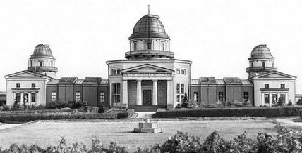 «В 1830 году профессор юрьевского университета В. Струве по Высочайшему повелению послан за границу со специальной целью осмотреть главнейшие обсерватории Западной Европы и разработать проект новой русской. Около этого же времени граф Кушелев-Безбородко предложил в дар под обсерваторию участок своей дачи на Выборгской стороне, но место это признано неудобным вследствие близости к городу. Назначенная специальная комиссия остановила выбор на вершине Пулковской горы, указанной самим императором Николаем I и лежащей к югу от столицы, в 14 верстах от Московской заставы, на высоте 248 футов над уровнем моря. Для разработки подробного проекта новой обсерватории в 1833 году образован комитет из академиков Вишневского, Паррота, Струве и Фусса, под председательством адмирала Грейга, уже соорудившего за несколько лет до этого обсерваторию. в Николаеве. Проект здания и самое его осуществление поручены архитектору А. П. Брюллову, а инструменты одновременно заказаны в Мюнхене Эртелю, Рейхенбаху и Мерцу и Малеру, в Гамбурге — братьям Репсольд. Закладка Пулковской обсерватории состоялась 21 июня 1835 года, а торжественное освящение оконченных зданий — 7 августа 1839 года. Общая стоимость сооружения достигла 2100500 руб. ассигнациями, включая сюда 40000 руб. ассигнациями, выданных государственным крестьянам, имевшим свои усадебные места на отчужденном под обсерваторию участке в 20 десятин. По § 2 устава обсерватории цель ее состоит в "производстве: a) постоянных и сколь можно совершенных наблюдений, клонящихся к преуспеянию астрономии, b) соответствующих наблюдений, необходимых для географических предприятий в Империи и для совершаемых ученых путешествий, и c) обсерватория должна содействовать всеми мерами к усовершенствованию практической астрономии, в приспособлениях ее к географии и мореходству, и доставлять случай к практическим упражнениям в географическом определении мест".