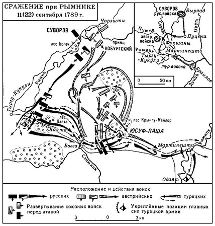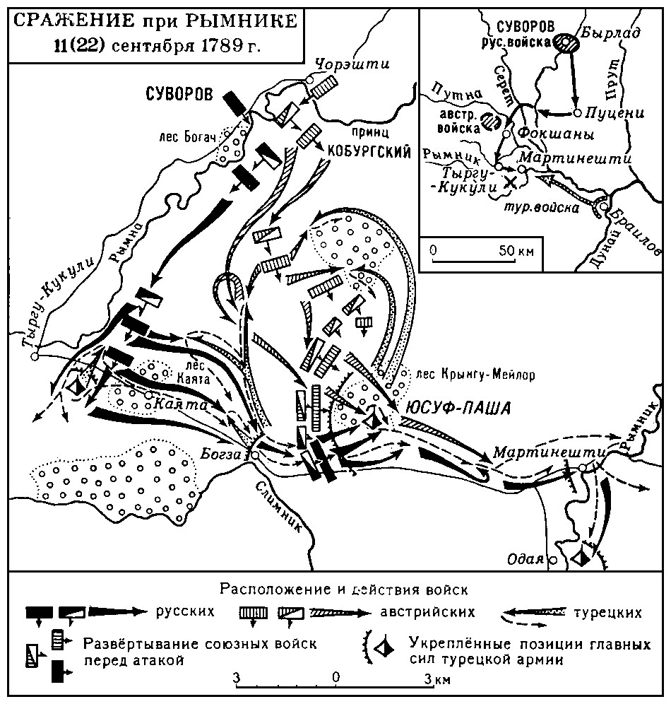 Рымник (Русско-турецкая война, 1787—1791). Река в Румынии, вблизи которой 11 сентября 1789 года произошло сра¬жение между русско-австрийскими войсками под командо¬ванием генерала А.В. Суворова (25 тыс. чел.) и турецкой ар¬мией под командованием Юсуф-паши (около 100 тыс. чел.). Воспользовавшись разъединением сил союзников, Юсуф-паша двинул основную армию против австрийского корпуса принца Ф. Кобургского (18 тыс. чел.). На помощь австрий¬цам выступил корпус Суворова (7 тыс. чел.). За 2,5 суток он прошел около 100 километров по размытым осенними дождями доро¬гам. Учитывая четырехкратное превосходство турок, принц Кобургский предлагал оборонительный план действий, но российский командующий настоял на немедленном наступ¬лении. Приняв командование над союзными войсками, Су¬воров двинул их вперед. Вечером 10сентября они начали наступление и, пройдя 14 км, форсировали незаметно для турок реку Рымну.