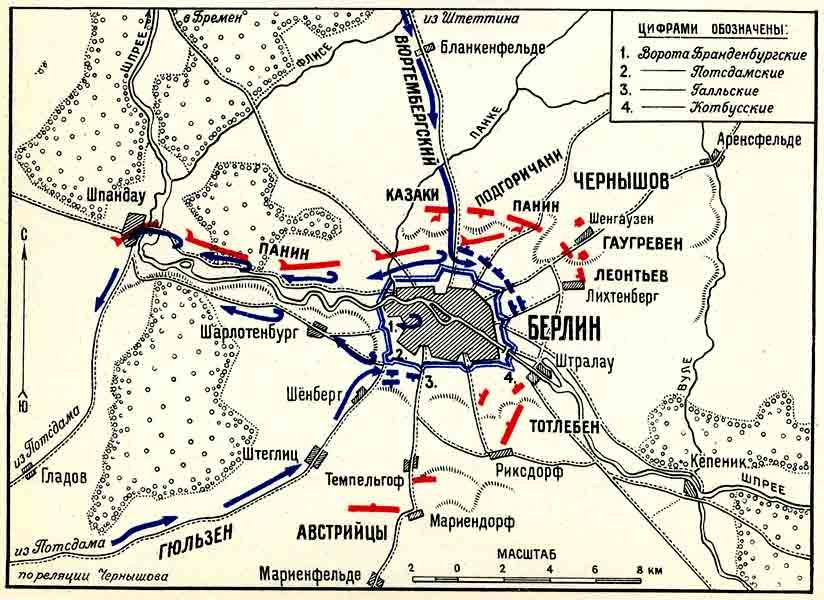 «После этого к Берлину, подошел на помощь принц Фридрих Виртембергский и генерал Гильзен (Hülsen), а к Тотлебену - русские генералы Чернышев и Панин и австрийский граф Леси. Начались ежечасные сшибки, а 29 сентября Чернышев назначил на рассвете напасть вдруг на весь неприятельский корпус, тогда как Тотлебен должен был сделать приступ к городу. Но Гильзен не дождался нападения и ночью с 28 на 29 число, пользуясь темнотою, вобрался в близлежащий лес и скрылся. Узнавши об этом на рассвете, Чернышев отправил немедленно требовать сдачи города, но его посланный встретился на дороге с офицером, посланным от Тотлебена объявить, что город сдается и он, Тотлебен, занимается составлением условий сдачи. Условия состояли в том, что все военные, находившиеся в Берлине, получили свободный выход со всем имуществом; королевский замок и другие публичные здания остались нетронутыми. Берлин должен был заплатить полтора миллиона талеров контрибуции и 200000 талеров на войско. Два дня (29 и 30 числа) победители занимались сбором контрибуции, забранием королевской казны и очисткою арсеналов и магазинов; чего забрать было нельзя, то все было истреблено; все пороховые мельницы около Берлина, литейные пушечные дворы, потсдамские и близ Шпандау находившиеся ружейные и шпажные заводы были разорены до основания.
