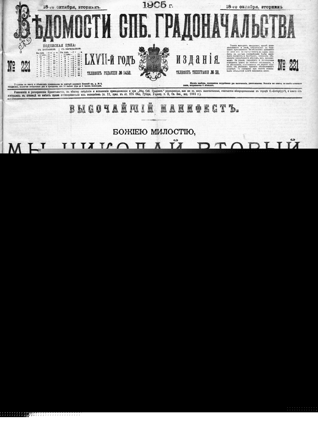 1905 год. 30 октября (17 октября ст.ст.) был опубликован манифест Николая II «Об усовершенствовании государственного порядка», который декларировал дарование гражданам России политических свобод, неприкосновенность личности, расширение избирательного ценза при выборах в Государственную Думу. Манифест 17 октября 1905 года был подготовлен председателем Совета министров Российской империи С. Ю. Витте, считавшим конституционные уступки единственным средством разрядить революционную атмосферу в России. «Первая русская революция (1905–1907) началась 9 января 1905 года. Этот день вошёл в историю России как «Кровавое воскресенье». В этот день в Петербурге царские войска расстреляли мирное шествие рабочих к Зимнему дворцу для подачи петиции царю о нуждах рабочих. Расстрел мирной демонстрации в Петербурге вызвал взрыв возмущения по всей стране. В городах проходят массовые забастовки, демонстрации и митинги протеста. Революционное движение нарастало. Оно охватывает новые районы и новые слои населения. Заколебались и вооружённые силы царизма. Об этом свидетельствовало восстание на броненосце «Потёмкин» (14 июня 1905 года). Повсеместно начинают создаваться Советы рабочих депутатов. Первый Совет рабочих депутатов был создан в мае 1905 года в Иванове-Вознесенске. Высший подъём революции приходится на октябрь и декабрь 1905 года. В октябре состоялась Всероссийская политическая стачка, которая охватила 120 городов. В ней приняло участие свыше 2 млн. человек. В этих условиях последний российский император Николай II вынужден был пойти на уступки. 17 октября 1905 года он подписал Манифест, который провозгласил в стране политические свободы и созыв законодательного органа в лице Государственной думы. Формально такой шаг означал превращение самодержавия в конституционную монархию. Манифест создавал легальные условия для образования политических партий. В 1906 году в стране насчитывалось уже более 50 партий».
