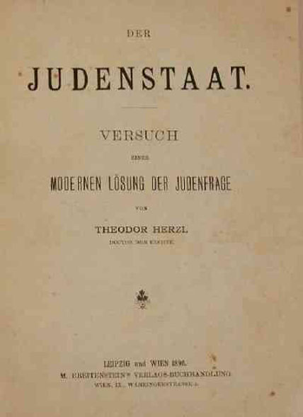 14 февраля 1896 года в Берлине выходит из печати книга Теодора (Беньямина Зеева) Герцля «Еврейское государство. Опыт современного решения еврейского вопроса» В своей книге основоположник сионизма утверждает, что подлинную свободу и безопасность еврейскому народу может обеспечить не эмиграция из одной страны диаспоры в другую и не ассимиляция, а только создание независимого еврейского государства В своей книге Герцль анализирует еврейскую проблему и проблему антисемитизма, рассматривает попытки, предпринимавшиеся в прошлом для разрешения этих проблем, и приводит читателя к выводу, что единственно возможное решение – создание независимого еврейского государства в Палестине или в Аргентине, в зависимости от выбора народа и с согласия великих держав. Для реализации этих планов Герцль предлагает сформировать финансовое учреждение, которое занималось бы сбором денежных средств, приобретением земельных участков, строительными работами и переводом финансов из диаспоры в еврейское государство. Герцль призывает к созданию комитета под названием «Еврейское общество» в качестве официального представительства еврейского народа. «Общество» должно подготовить условия для создания еврейского государства и выбрать его географическое местонахождение. «Еврейское общество» должно также по плану Герцля организовать армию и определить, как будет выглядеть еврейский национальный флаг. «Я представляю себе белый флаг с семью золотыми звездами. – Пишет он. – Белизна символизирует новую жизнь, ее чистоту, звезды же – это те самые золотые семь часов работы, – ибо именно под знаком труда войдут евреи в свою новую страну».