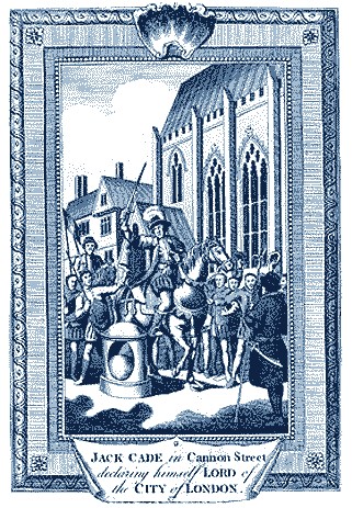 «Восстание Джека Кэда - восстание в Англии в 1450; было вызвано резким обострением социальных противоречий в обстановке засилья в стране крупных феодалов и усиления феодальной анархии (царствование Генриха VI Ланкастера, от имени которого правила клика крупных феодалов), усиления налогового гнета и поражений англичан в Столетней войне с Францией, издания новых законов против наемных рабочих и т. д. Помимо крестьянства, составлявшего основную силу восстания, в нем участвовали городские ремесленники, частично купечество и мелкое дворянство (джентри), т. е. те слои населения, которые стремились к прекращению неудачной для Англии Столетней войны, феодальных усобиц и к упрочению королевской власти. Восстание началось в конце мая. Оно охватило Кент и некоторые другие графства Южной Англии (Суссекс, Суррей). Во главе его встал Джэк (точнее Джон) Кэд (Cade), человек, опытный в военном деле (бывший солдат), ирландец по происхождению (о нем сохранились лишь скудные и противоречивые сведения). Он выдавал себя за Мортимера, родственника герцога Йоркского, врага правившей династии Ланкастеров (с Норками восставшие связывали свои надежды на усиление центральной власти). Армия повстанцев (по-видимому, не менее 40 тысяч человек) двинулась к Лондону. Правительству был предъявлен ряд политических требований (изложенных в особом документе - "Манифесте", или "Прокламации", а также в "Жалобах общин Кента"). Восставшие требовали облегчения налогового гнета, протестовали против плохого управления и произвола чиновников и феодалов на местах, против вмешательства пр-ва в выборы представителей в парламент от графств, они добивались отставки дурных советников и призвания к власти герцога Йоркского; они требовали также отмены т.н. рабочего законодательства. Разбив 18 июня при Севеноксе королевские войска, повстанцы подошли к Лондону, расположившись в его пригороде Саутуорк. Затем при поддержке народных масс Лондона они вошли в столицу, из которой бежал король Генрих VI. Восставшие казнили ненавистных народу королевских советников - лорда-казначея и мэра Лондона. Однако новый мэр и лондонские купцы, недовольные сборами денег с богатых людей, проведенными восставшими, и нападениями на дома богачей, вытеснили восставших в пригород. Архиепископ Йоркский (канцлер королевства) обещал восставшим амнистию, если они разойдутся. Восставшие начали расходиться. Кэд со значительной частью повстанческой армии 9 июля отступил к Рочестеру (в Кенте), но затем вынужден был бежать в графство Суссекс, где в стычке с правительственными войсками был смертельно ранен. С его смертью (12 июля) восстание пошло на убыль, но не прекратилось. Восставшие выдвинули новых руководителей (их тоже называли "Джэк Кэд"). Пр-во лишь с трудом окончательно подавило восстание. Была проведена карательная экспедиция - "жатва голов", во время которой наиболее активные участники восстания были казнены».