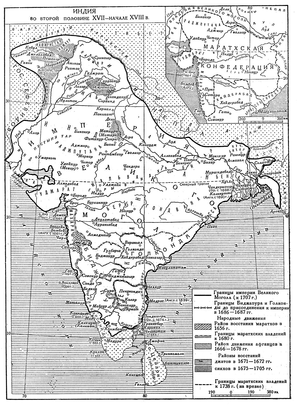«Многочисленные выступления против власти Моголов различались по своему классовому составу, характеру и целям. Восстания маратхов (начиная с 1656 г.) в северозападной части Декана и афганцев (1666—1678) на северном и южном склонах Сулейманова хребта были направлены против чужеземного господства и представляли собой освободительные движения. Целью восставших народов было освобождение от власти Моголов и образование самостоятельных государств. Народные массы принимали в этих восстаниях широкое участие, но руководство ими принадлежало мелким феодалам (у маратхов) и племенной знати (у афганцев). Пользуясь раздробленностью афганских племен, Аурангзеб сумел подавить восстание афганцев и заточил в темницу его вождя Хушхаль-хана Хаттака. Однако маратхского восстания Моголам подавить не удалось.