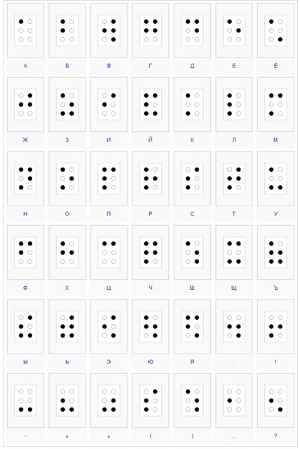 Во Франции опубликован труд Луи Брайля «Способы напечатания слов, нот и математических знаков, выполненных шеститочиями». Эта система стала основой общепринятой сегодня во всем мире системы письменности для слепых. Луи Брайль, родилсяв в 1809. Его семья жила в деревне Куврэ под Парижем. Отец был шорником, мастером седельных дел. В детстве Луи повредил себе глаз ножом в отцовской мастерской. Началась инфекция, которая перекинулась на второй глаз, и вскоре он полностью ослеп.В это время в Париже открылась одна из первых школ слепых в мире.- Institution Royale des Jeunes Aveugles (Королевский Институт для Слепой Молодежи) и юному Луи посчастливилось поступить в нее. Программа Национального института для слепых, была широкой и разнообразной. Воспитанников в институте обучали грамоте, музыке, вязанию и ткачеству.Брайль преуспевал во всех науках, но его главным увлечением стала самостоятельная разработка системы письменности для слепых.Луи не было и 16 лет, когда его осеняет гениальная идея - создать условный алфавит из различных комбинаций шести рельефных точек, расположенных в две колонки по три.4 15 26 3 В этой системе возможны в целом 63 перестановки. Расстояние между двумя точками Брайля 2-2,5 мм, и для прочтения текста "читатель" проводит кончиками пальцев по выдавленным строчкам. После долгого обдумывания и доработки в 1829 году Луи Брайль опубликовывает небольшой труд с изложением своей системы, которую он дополняет знаками препинания, цифрами и нотными знаками. Окончательный вариант его рельефно-точечного шрифта увидел свет в 1837 году.В системе Брайля нумерация точек идёт сверху вниз по столбцам. Чтобы потом при чтении было удобнее, нумерация точек при записи идёт в обратном порядке — сначала по правому столбцу, затем по левому: точка 1 находится в верхнем правом углу, под ней — точка 2, в нижнем правом углу — точка 3. В левом верхнем углу находится точка 4, под ней — точка 5, в левом нижнем — точка 6.Существует всего 63 различных символа. Вследствие такой ограниченности общего числа различных комбинаций точек, часто используются двуклеточные знаки (состоящие из двух знаков, по отдельности имеющих свои функции), дополнительные знаки (большие и малые буквы разных алфавитов, цифровой знак и т. д.). Каждая комбинация имеет несколько значений, порой доходящих почти до десятка.Кириллица брайлем.