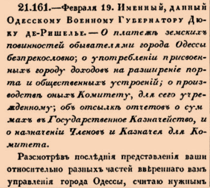 21.161.-Февраля 19. Именный, данный й Одесскому Военному Губернатору Дюъ ку де-Ришелье.- О платежѣ земскихъ повинностей обывателями города Одессы безпрекословно; о употребленіи присвоенныхъ городу доходовъ на разширеніе порта и общественныхъ устроеній; о производствѣ оныхъ Комитету, для сего учрежденному; объ отсылкѣ отчетовъ о сум махъ въ Государственное Казначейство, и о назначеніи Членовъ и Казначея для Комитета.