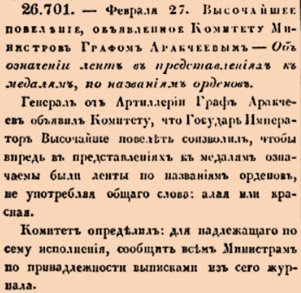 Генералъ отъ Артиллеріи Графъ Аракчеевъ объявилъ Комитету, что Государь Императоръ Высочайше повелѣть соизволилъ, чтобы ы впредь въ представленіяхъ къ медалямъ означаемы были ленты по названіямъ орденовъ, не употребляя общаго слова: алая или красная.