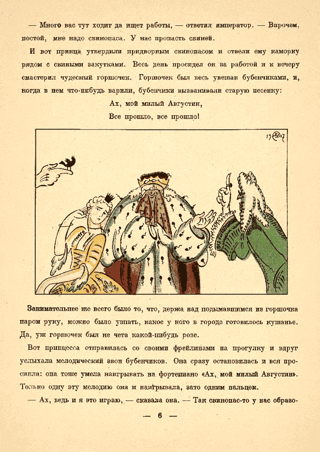 Фрейлины обступили ее и растопырили свои юбки; свинопас получил десять принцессиных поцелуев, а принцесса – горшочек. Иллюстрация в книге