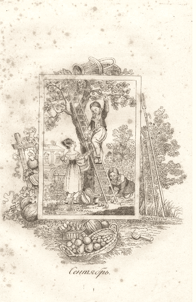 Венок, сплетённый из двенадцати раcсказов, посвящаемый юным друзьям природы. С двенадцатью гравированными картинками. – Москва, в Типографии А. Семена, При Императорской медико-хирургической академии, 1842. Гравюра на меди.
