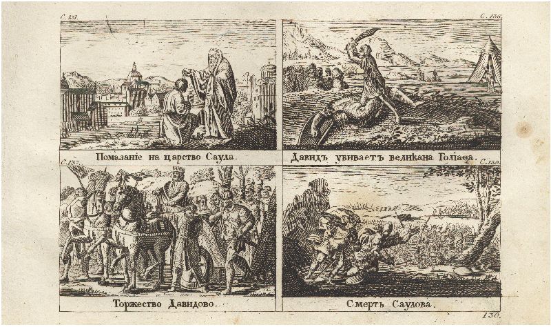 Помазание на царство Саула. Давид убивает великана Голиафа. Торжество Давидово. Смерть Саулова. Иллюстрации к книге