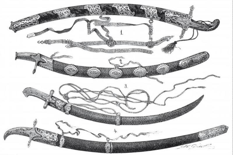 1) Тесан царя Михаила Федоровича, 2) сабля князя Д. М. Пожарского, 3) сабля Минина, 4) сабля Владимира Мономаха. Рис. И. Суслов, грав. М. Рашевский.