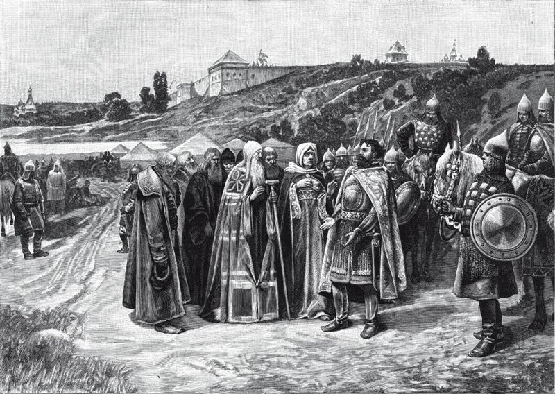Владимир Мономах, пришедший в Киев, чтоб наказать Святополка, выслушивает моления митрополита Киевского и мачехи своей.