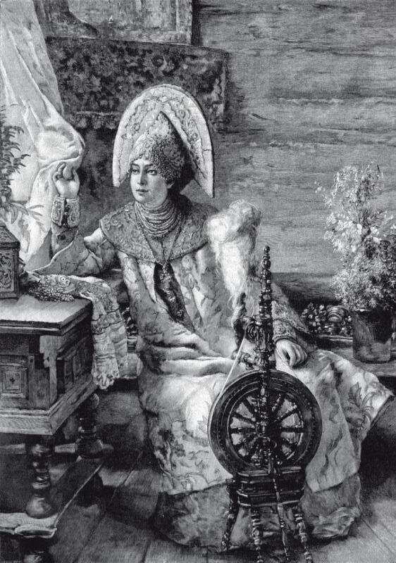 За прялкой.