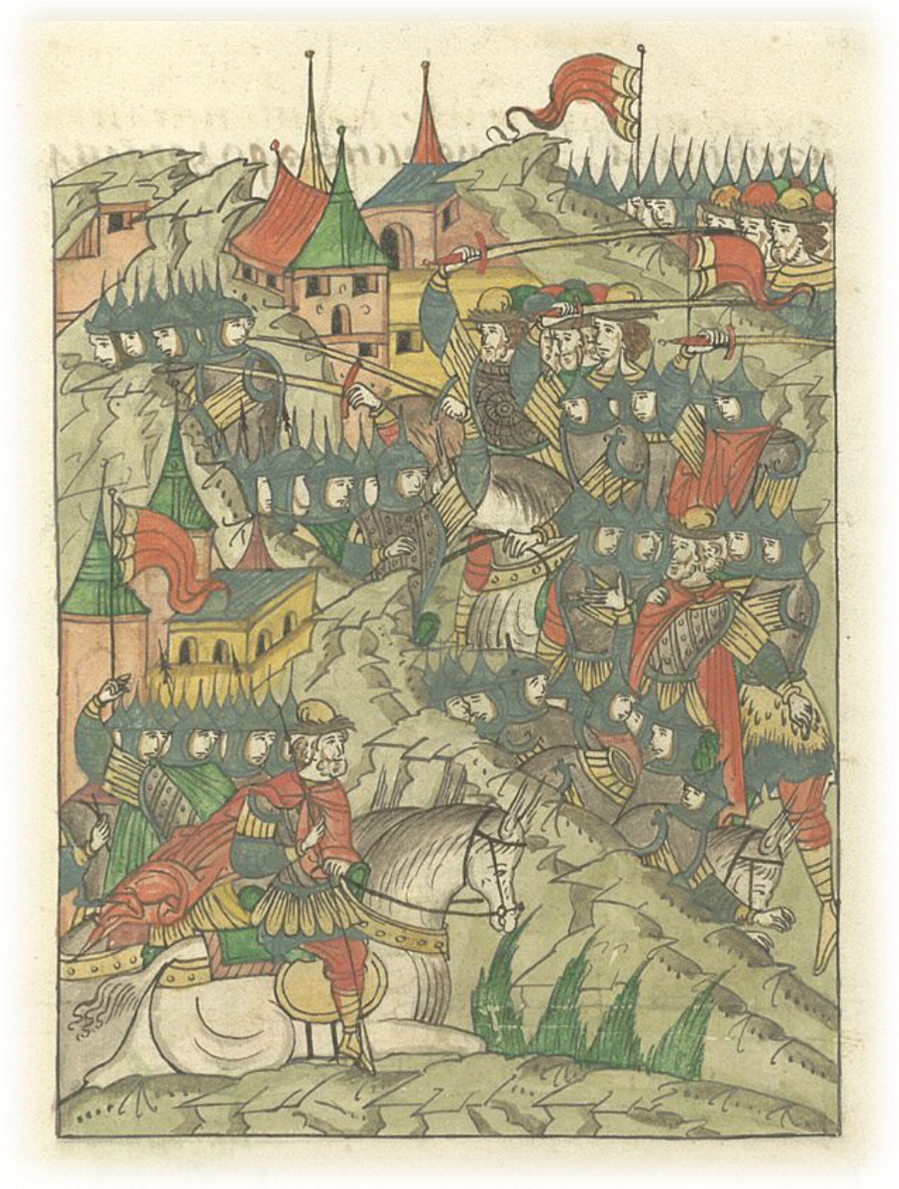Языки говорят воеводам царя Ивана Васильевича, что магистр окопался большим рвом вокруг города Рындола, бьет из пушек и пищалей и приступает к Рындолу.