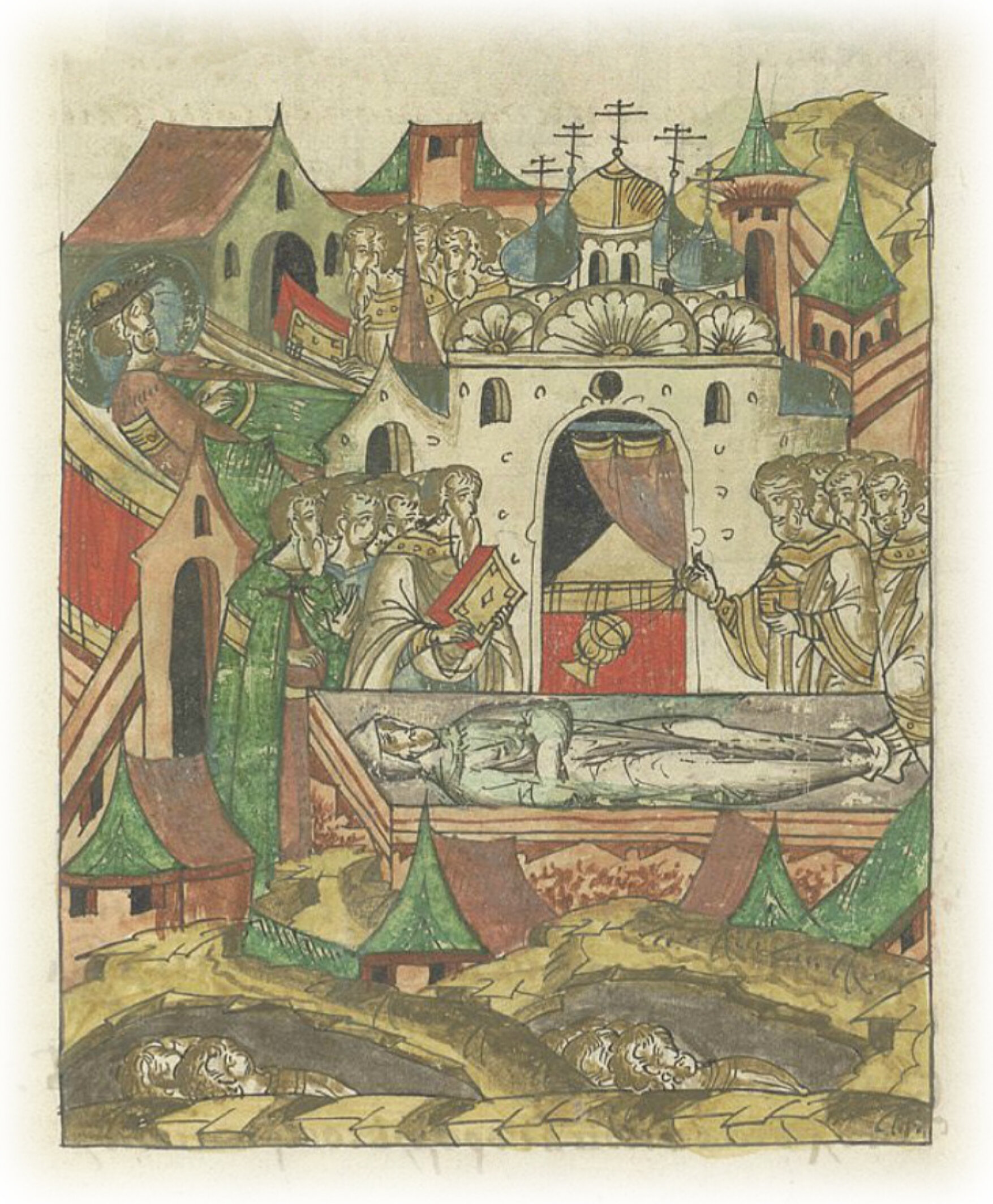 Кончина князя Василия Владимировича во время мора и его похороны в церкви архангела Михаила в Москве.
