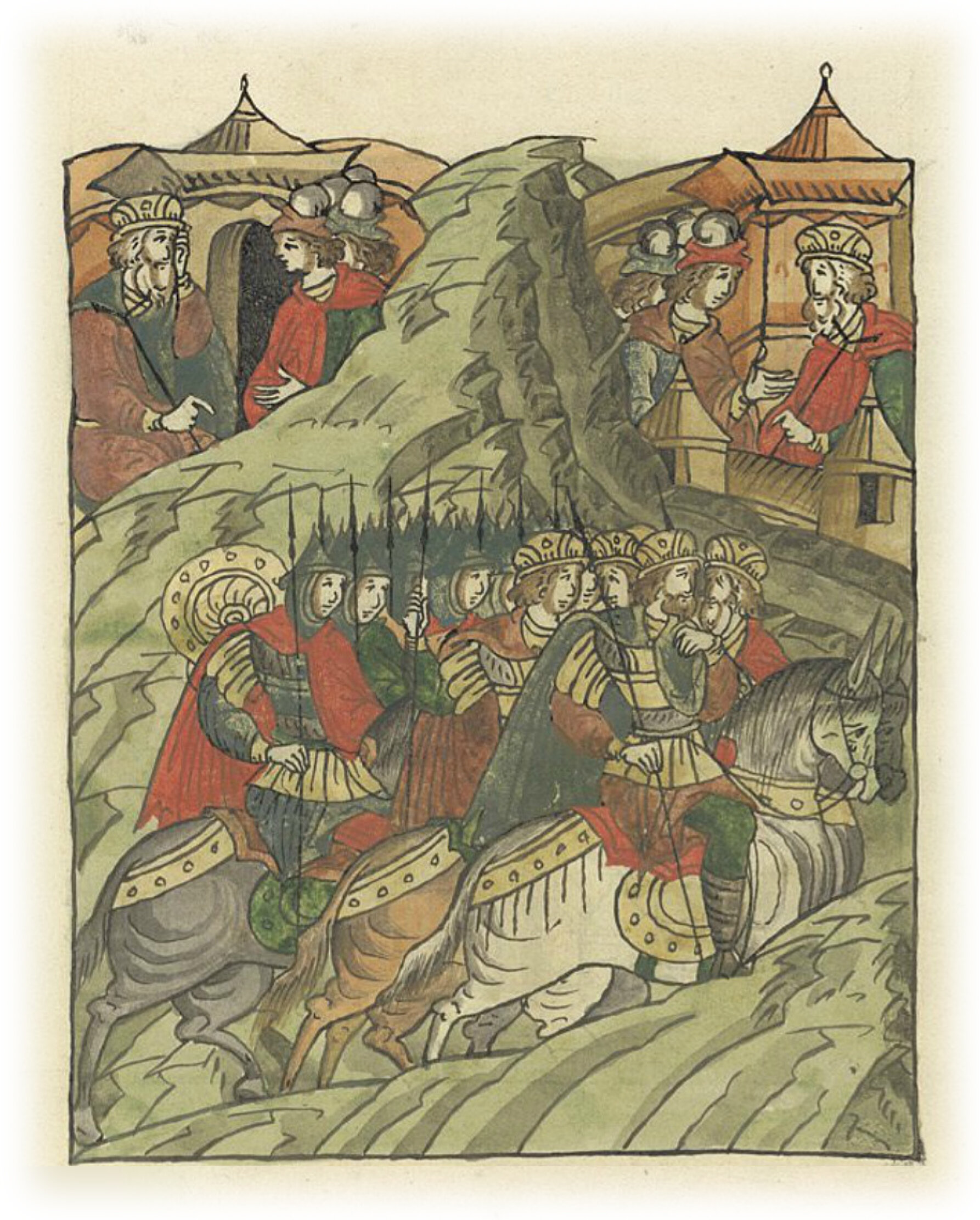 Воеводы царя Ивана Васильевича, разделившись, идут в погоню за царем Емгурчеем.