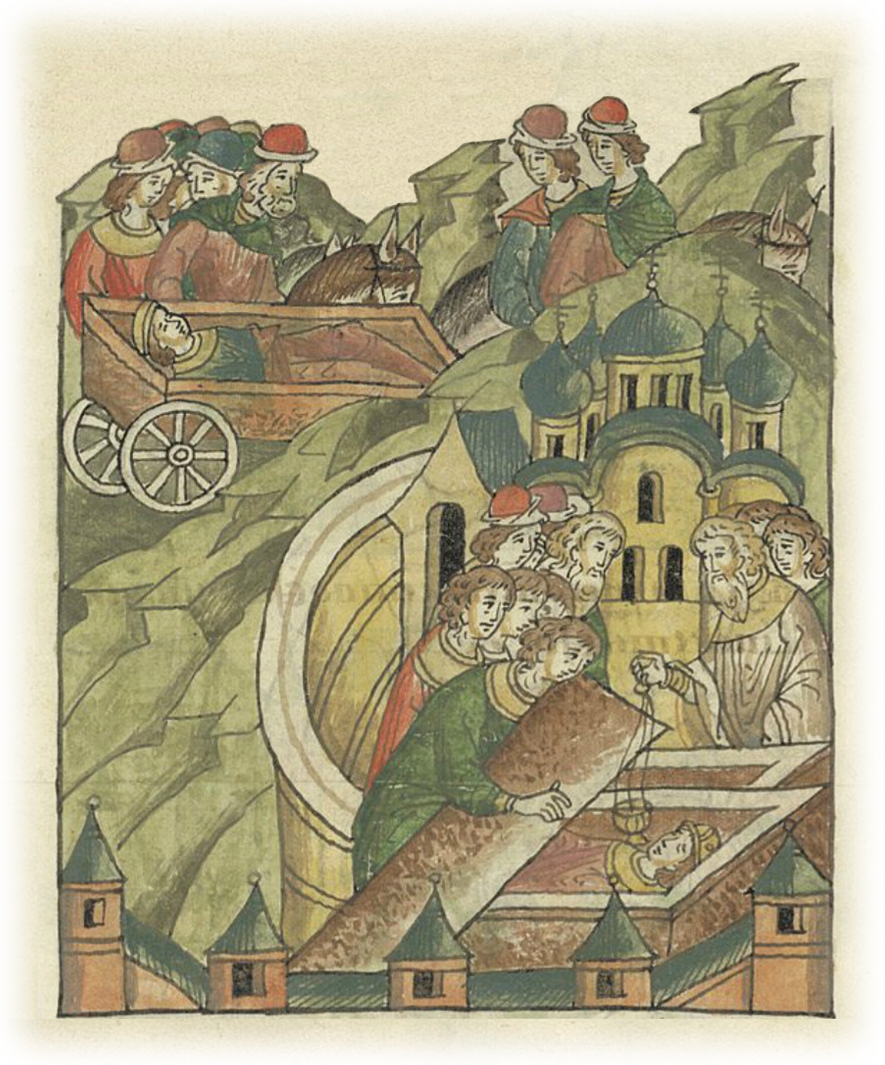 Отвезли его из Торжка в Новгород и положили в святой Софии, в церкви пречистой Богородицы, в головах деда его.