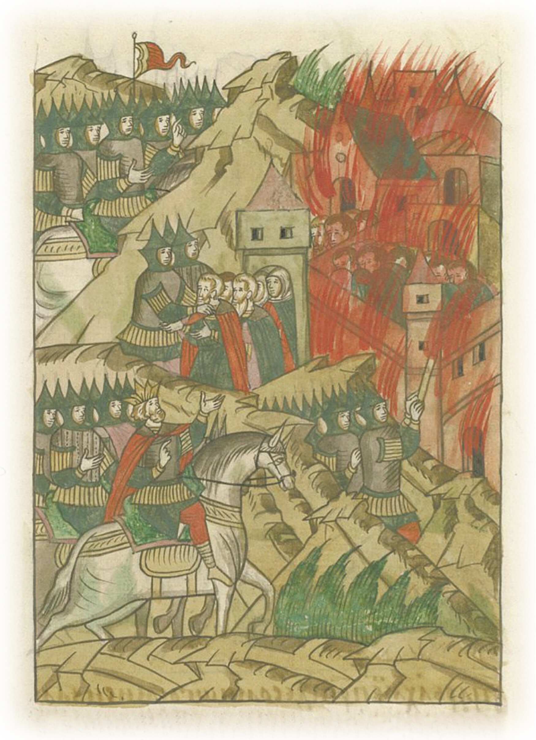 В пятницу же снова приступили к городу со многими силами и так огнем запалили его; и что в нем людей было, все сгорели, а тех, кто выбежал от огня, схватили.