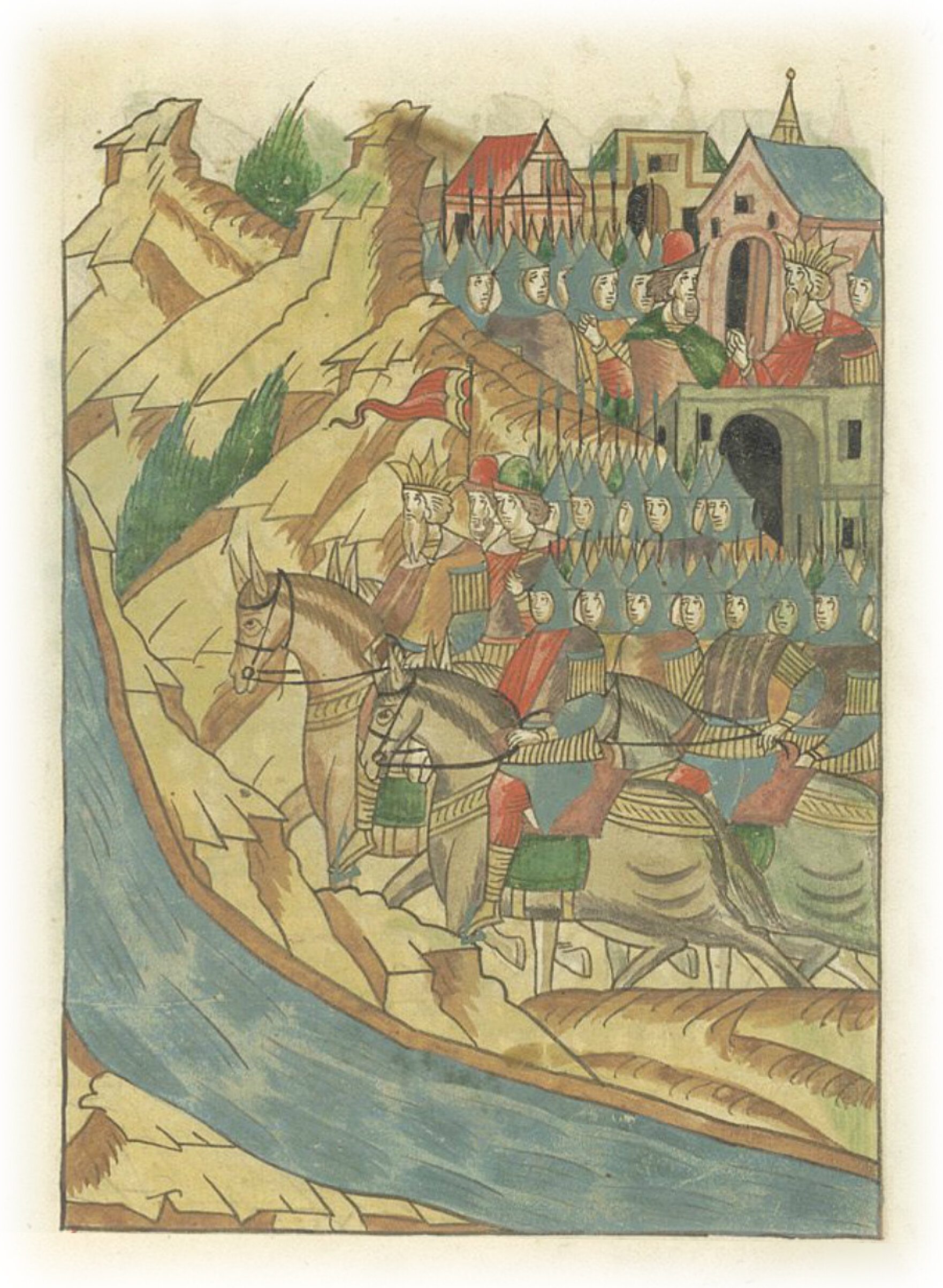 Царь Тохтамыш со своими князьями и татарами идет к Волге, намереваясь напасть на великого князя Дмитрия Ивановича.