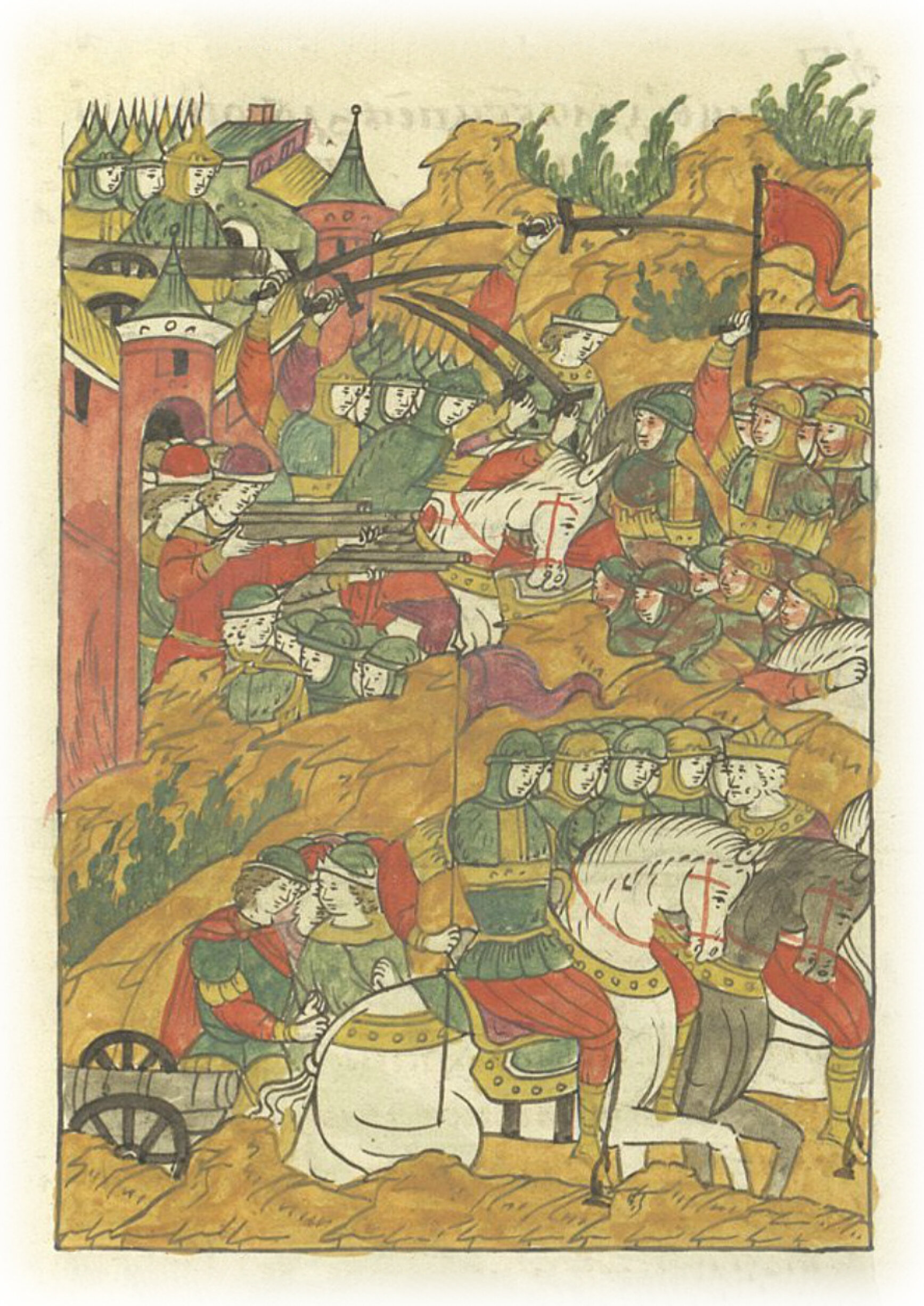 А когда подошел магистр с полками к городу, вышли против него конные дети боярские и стрельцы, и убили стрельцы и дети боярские у магистра из пищалей человек сто; и стрельцов государевых убили с полтораста человек, а иные дети боярские и боярские люди, и стрельцы, дал Бог, все здоровы. И пошли немцы прочь, городу и людям государевым не успев никакого зла сотворить.