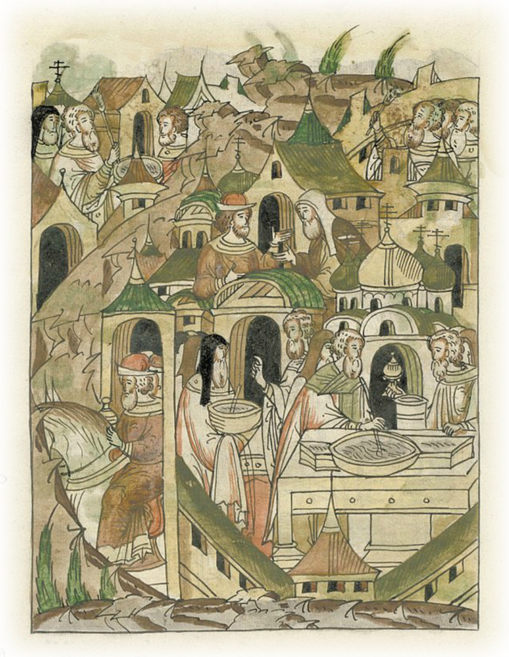 И, услышав об этом, боголюбивый архиепископ Макарий стал поучать игуменов и священников, и сам ходил в соборную церковь святой Софии и молебен совершал, и мощи святых омывал, и посылал святую воду по всему Новгороду и Пскову.