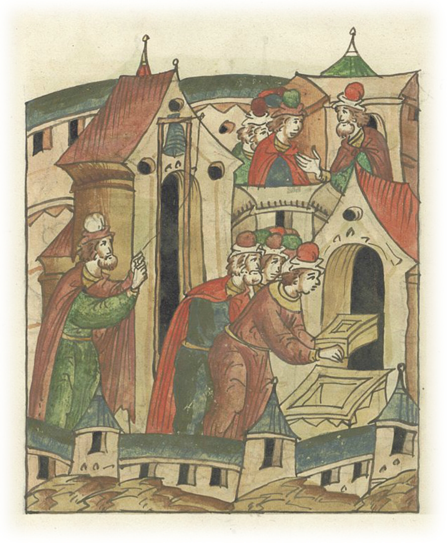 Ругодивские посадники Яким и Захар приезжают в Москву. Воеводы царя Ивана Васильевича Алексей Адашев и Иван Михайлов сообщают им, что государь пожалует их, если сдадут его воеводам помимо Ругодива Вышгород.